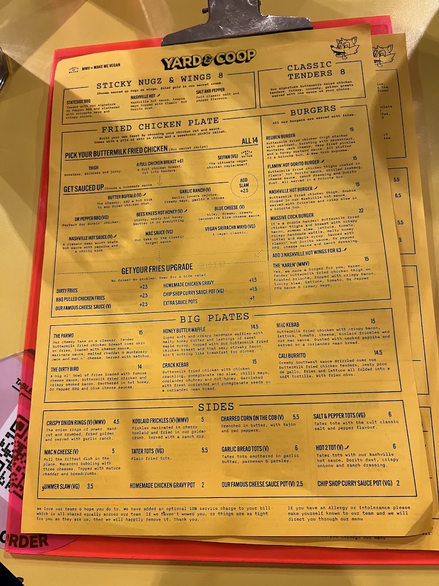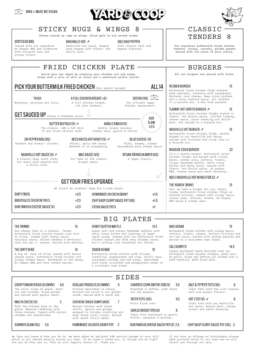 Don’t skip the delightful sides like crispy onion rings and vegetarian 'Not Chicken' Nugz, adding a crunchy contrast to the rich mains. With attentive service and a vibrant atmosphere, dining at Yard & Coop is an experience to savor, leaving you eagerly anticipating your next visit.